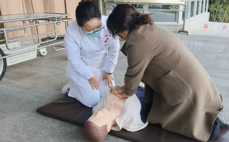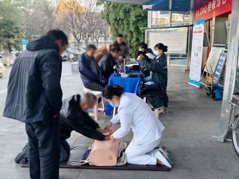活动现场,重症医学科CCU李雪杰副主任医师、心血管内科五病区滕嘉琦医师坐诊咨询,耐心为前来就诊的群众解答高血压、冠心病、心肌梗死等心血管疾病相关疑问,提供个性化诊疗建议。段秋燕护士长、完瑞玲护士长带领的护理团队则开展免费血压测量服务,讲解日常饮食、用药及康复护理要点。此外,护理团队还进行了心肺复苏(CPR)现场模拟教学,通过手把手指导、动作分解演示等方式,这种“理论+实践”的宣教模式,极大地提升了公众的急救技能与自救互救信心。