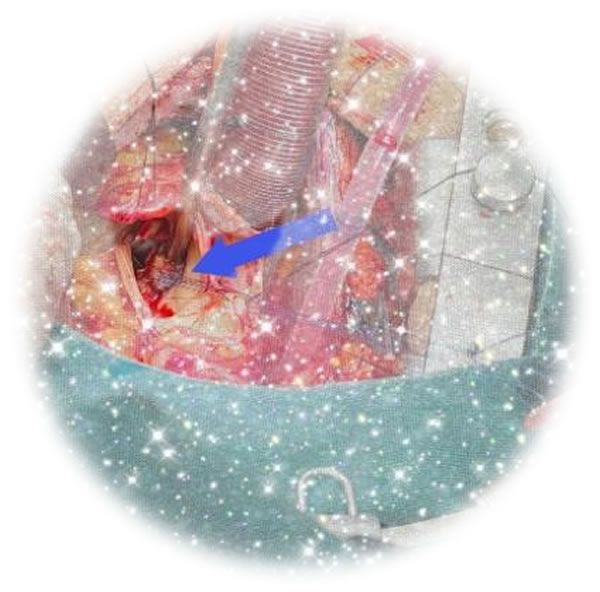 术中箭头所指为无冠窦窦壁被细菌完全侵蚀,涤纶补片加固成形