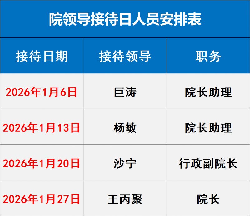 为进一步提升医疗质量、医疗安全和服务效率,不断改善群众看病就医体验,我院特设立 “院领导接待日”,院领导面对面接待群众来访,现场答疑解惑,切实落实 “医院领导要把职工的利益放在第一位,全院职工要把患者的需求放在第一位” 的核心要求,现将2026年1月医院“院领导接待日”安排公示如下: