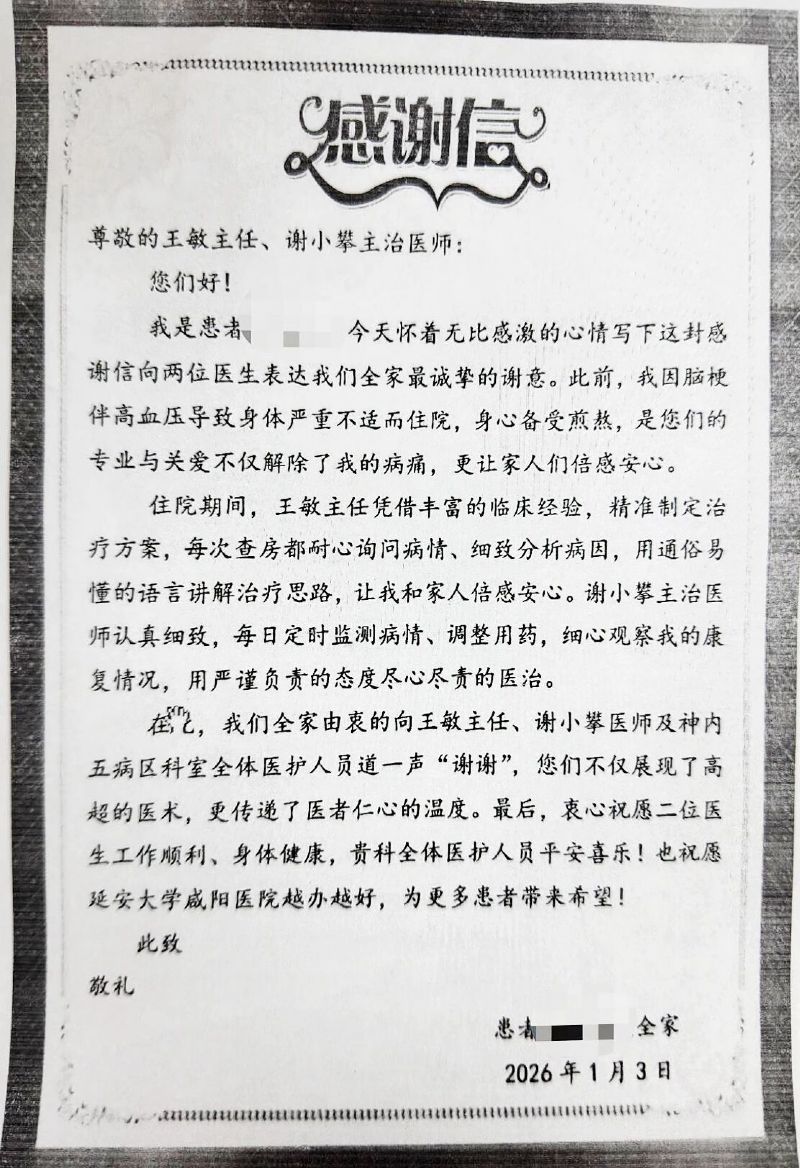 一纸感谢信诉说医患深情,延安大学咸阳医院神经内科五病区以专业与温度守护患者健康,点亮生命希望。