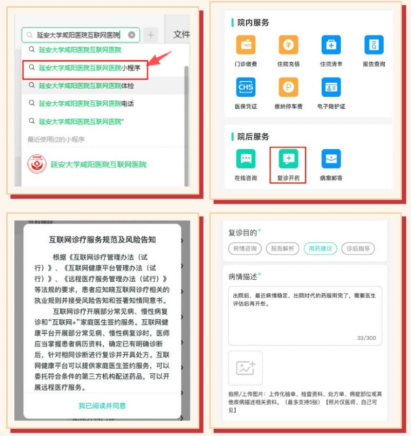 手机微信扫码或搜索“延安大学咸阳医院互联网医院”小程序 → 点击注册绑定【患者信息】→【复诊开药】→ 【选择医生】→ 【点击阅读并同意】→ 支付复诊费用,医生接诊开方即可。