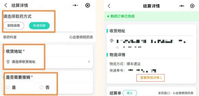 快递到家:填写收货地址,药品由医院药房统一发出,全国配送;