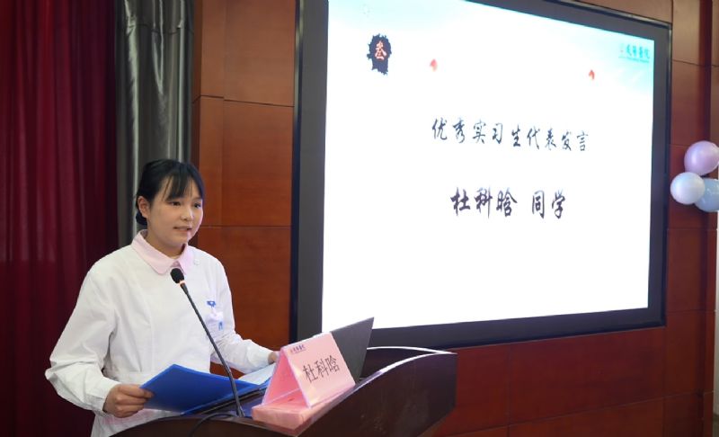 优秀实习生代表、来自渭南职业技术学院的杜科晗同学分享了自己的实习体会。她感谢医院提供的优质学习平台和带教老师的悉心指导,使理论知识与临床实践得以紧密结合,并在实践中深刻体会到护理职业的崇高价值。她表示,这段宝贵的实习经历不仅提升了专业技能,更坚定了职业信念,未来将继续秉持初心,在护理道路上踏实前行。