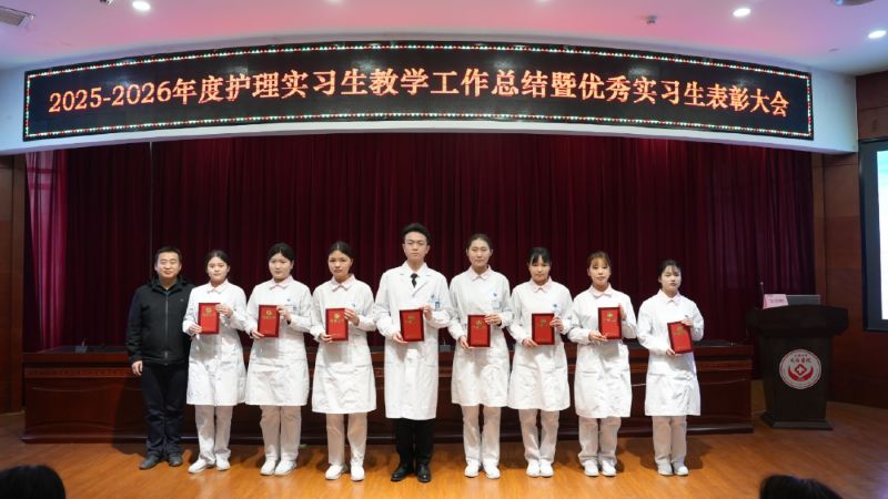 在表彰环节,科教部部长王绍辉宣读“2025-2026年度优秀护理实习生”表彰名单。与会领导为获奖同学颁发荣誉证书,这份荣耀既是对他们刻苦学习、积极实践的肯定,也是对全体实习生的鼓舞与引领。