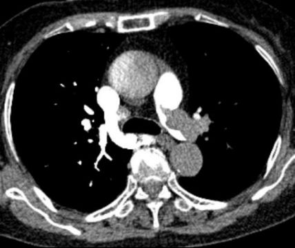 图:胸部增强CT(CTPA)示右肺动脉主干及分支内可见多发充盈缺损提示肺动脉栓塞